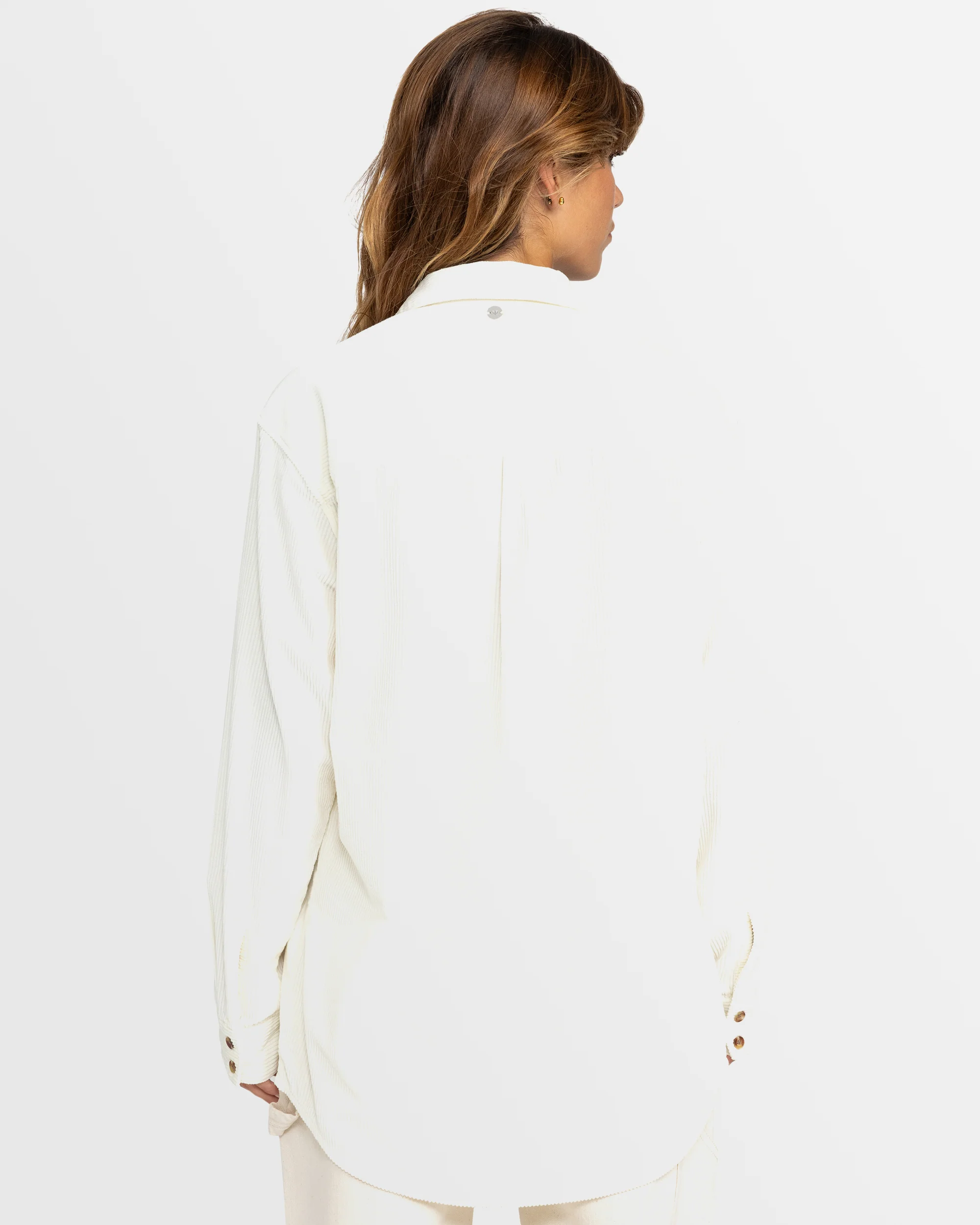 The Let It Go corduroy shirt is the perfect transition layer to carry you through the seasons. With a roomy boyfriend fit and a heavyweight feel, it's styled with patch pockets, partially recycled tortoise buttons, and tailored trims for an elevated look. Wear it on its own or layered over your favorite tee for easy style. Featured here in the Egret colorway.